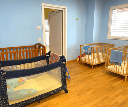 Nella grande stanza della nanna troviamo lettini diversificati in base all’età e alle esigenze di ciascun ospite della nostra comunità educante.