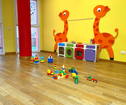 Il Salone dei giochi: nel grande spazio luminoso due grandi giraffe in legno sorvegliano i giochi dei bimbi. Contenitori vari custodiscono le costruzioni, le bambole, le automobiline e tantissimi altri giochi. Ci sono una piccola tana e un grande tappeto che diventano intriganti spazi da esplorare con la fantasia.