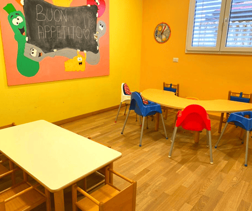 Buon appetito nella comoda stanza della pappa con tavoli, sedie e seggioloni che si adattano per altezza alle competenze e all’età di ciascuno dei bambini.