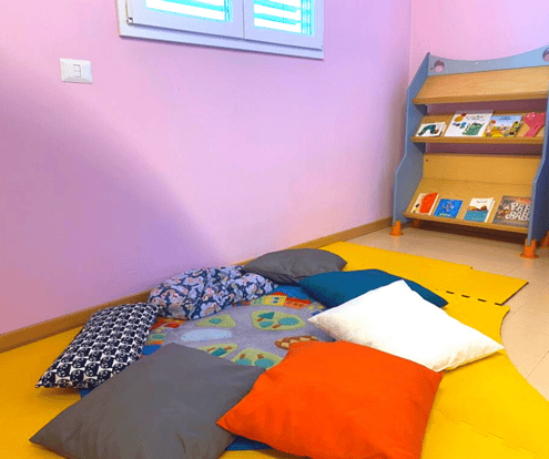 La nostra stanza della lettura è caratterizzata da un grande tappeto al centro e dei morbidi cuscini grazie ai quali bambini ed educatrici posso leggere i libri in un delicato silenzio.